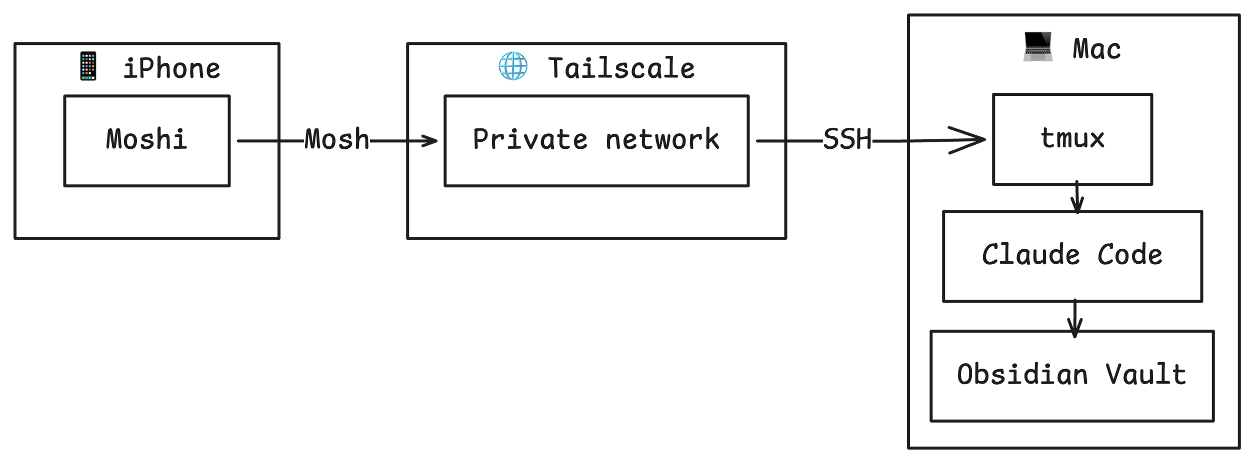 Claude Code runs on my MacBook with access to my Obsidian vault. Tailscale creates a private network so my iPhone can reach the Mac from anywhere, and SSH connects them. A tool called tmux keeps the session alive when the phone disconnects, so I can pick up mid-conversation after losing signal or locking the screen.
