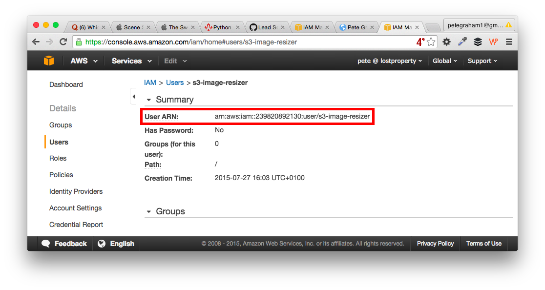 }You’ll need to change the resource to match your user. Thankfully the Users ARN is easy to find. Go to the AWS user console, select your user, the information is in the summary.