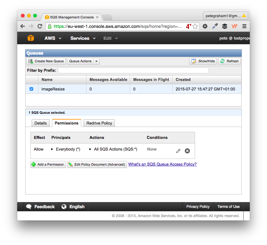 ###2. Create an SQS instance Use the AWS SQS console to create a new queue. Next set-up queue’s permissions. The fastest (but least secure) way is to allow “Everybody” and “All SQS Actions”.
